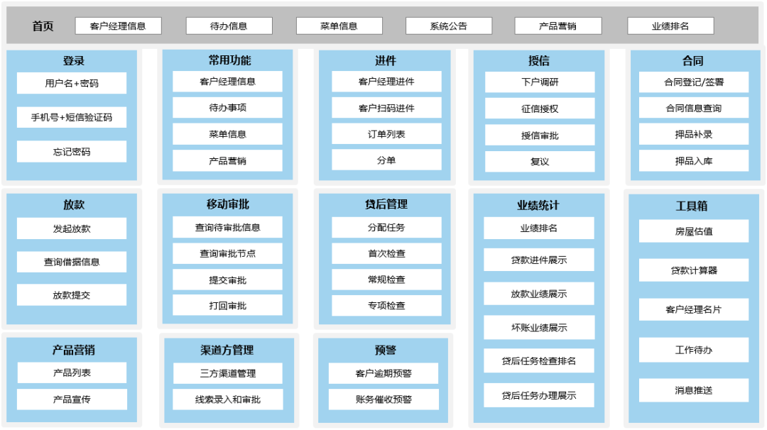 支持产品营销、客户管理、意愿核实、贷前调查、贷中审批、贷后管理等业务功能全覆盖,集成OCR、人脸识别、活体检测、音视频等智能技术,实现信贷业务一站式全流程电子化和移动化办理。